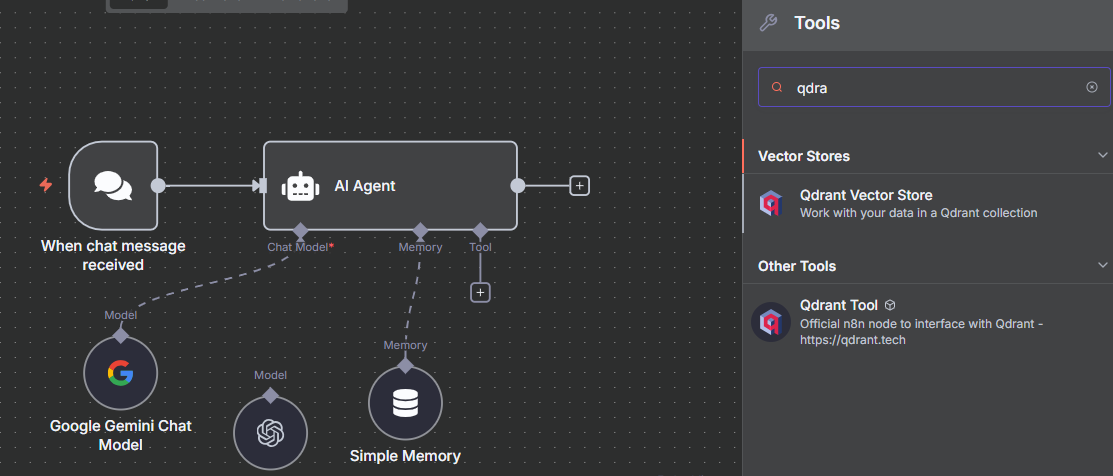 3. 在右下角的 "Tools" 面板中,點擊加號,搜尋並加入 "Qdrant Vector Store" 節點。