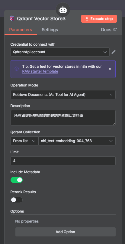 4. Collection Name: 輸入我們使用的 Collection 名稱 nhi_text-embedding-004_768